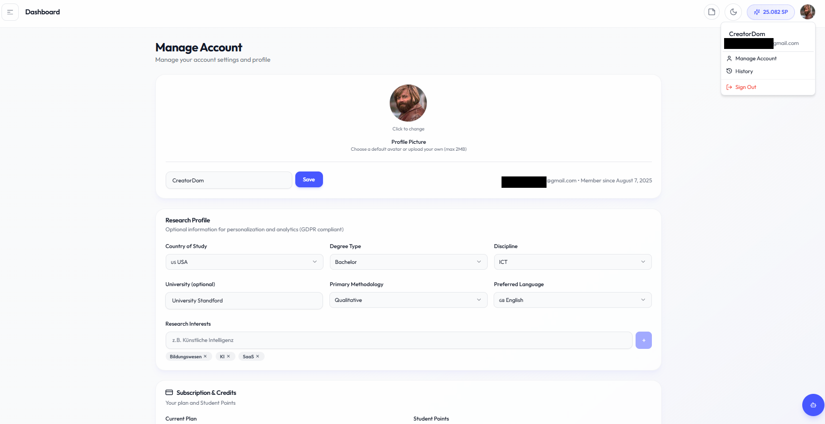 Your account page provides access to profile settings, subscription management, and security options.