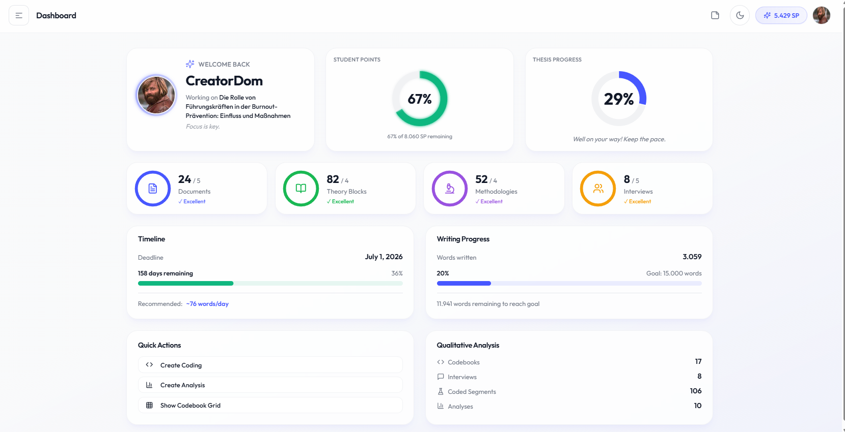 The Dashboard is your central hub for tracking thesis progress and accessing all platform features. It provides an at-a-glance view of your work status.