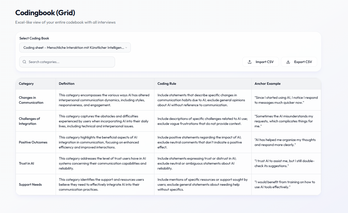 Content analysis requires a systematic coding scheme. Each category needs a clear definition, coding rule, and anchor example. This feature provides a structured interface to build and maintain your codebook.