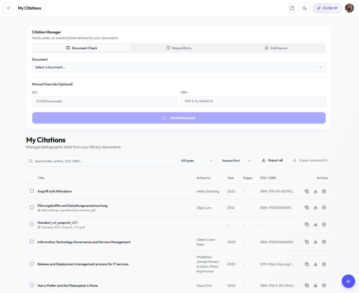 Document Check — Select an uploaded document and verify its existing citation metadata (DOI, ISBN, formatting)